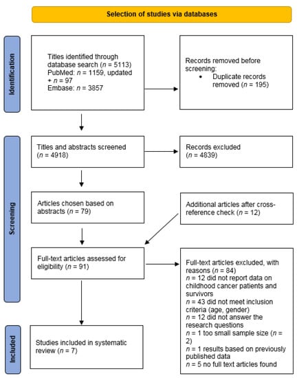 The initial search was conducted on 17 January 2022. As great accomplishments have been made regarding childhood cancer treatment, survival and fertility counselling and preservation in the past 25 years [1,2,20,21,22,23,24,25], only relevant articles regarding qualitative and quantitative studies published in English after 1997 were included by systematically searching the PubMed database. Key words included childhood cancer, infertility, counselling and experience. The Medical Subject Heading (MeSH), Title/Abstract (TiAb) and author’s keyword (kW) terms used, including the search syntax, are provided in Supplementary Table S1A,B. This review has not been registered.