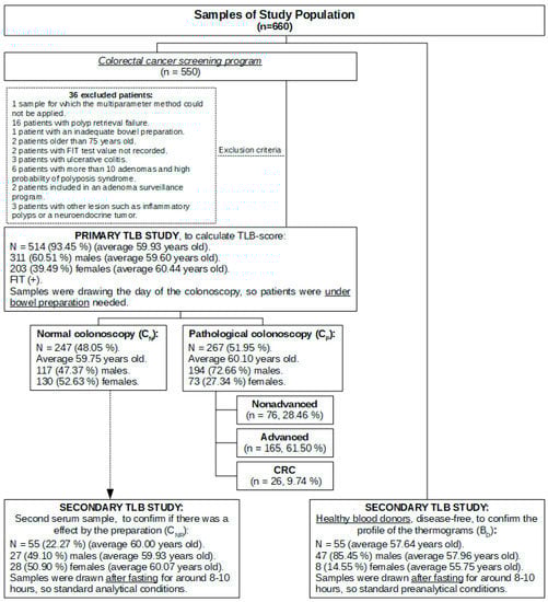 Towards this goal, we proposed a study to develop a simple, risk-free, and low-cost clinical test to discriminate FIT(+) patients with a high risk of CRC who should undergo a further colonoscopy procedure, with the aim of reducing the excessive number of unnecessary colonoscopies in current screening programs. Because thermal liquid biopsy (TLB) measures the denaturation profile of blood samples in a simple manner and it is very sensitive to changes in serum protein composition associated with cancer [13,14,15], we considered it a suitable technique for this purpose.