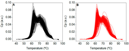 The direct comparison of average TLB thermograms of the 55 selected patients with a normal colonoscopy under the two different conditions, a first blood sample drawn under a colonoscopy preparation and a second blood sample drawn under standard pre-analytical conditions, is shown in Figure 5B. As it can be observed, the average thermograms exhibited markedly different features. Detailed examples of each patient comparison, corresponding to 16 individual TLB thermograms, are presented in Figure S4. In most of them, the second blood sample (drawn under standard preanalytical conditions) could be easily identified as it showed uniform, conserved features among all patients (blue curves in Figure S4) and, very importantly, they seemed quite similar to the typical healthy TLB thermogram. Regarding the first blood sample (drawn under colonoscopy preparation conditions), a greater variability was found between patients (black curves in Figure S4), and their TLB profiles differed much more from the typical healthy TLB thermogram.