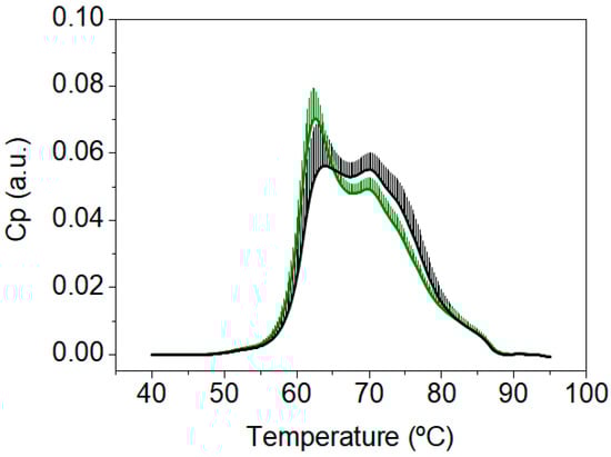 TLB profiles and TLB scores were determined after analyzing the thermograms obtained from the serum samples. These thermograms were recorded using an automated high-sensitivity differential scanning VP-DSC microcalorimeter (MicroCal, Malvern-Panalytical, Malvern, UK). The thermogram consists of the experimental determination of the excess heat capacity of the sample, with regard to a buffer reference solution, as a function of temperature along the thermal denaturation process. Each serum sample was diluted (1:25) in filtered phosphate-buffered saline (PBS) and 400 μL was taken for the assay. Experiments were performed at a scanning rate of 1 °C/min. Thermograms were baseline-corrected and analyzed using software developed in our laboratory implemented in Origin 7 (OriginLab).