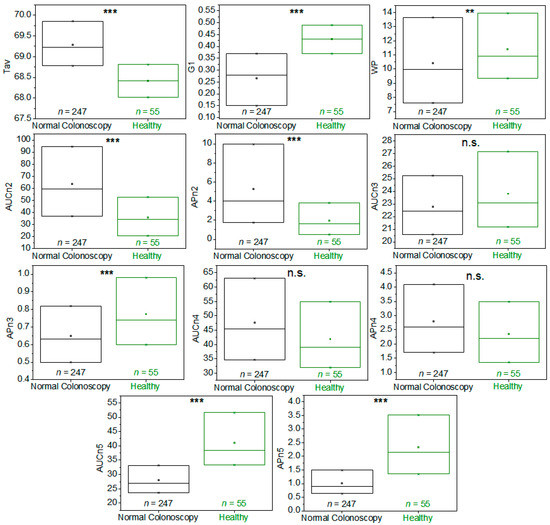 When the TLB parameters were determined for this healthy BD group (detailed description of can be found in Table S11) and the bivariate statistical analysis was performed, statistically significant differences could be determined for all parameters, except AUCn3, AUCn4, and APn4, when comparing patients from the colorectal screening program with a CN diagnosis and healthy BD (p-value < 0.05) (Figure 4 and Table S12).