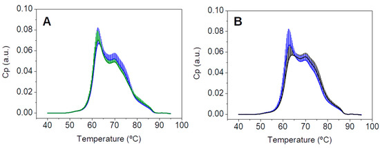 (A) Average and standard deviation of the thermograms from healthy BD (green, n = 55) and patients (blue, n = 55); (B) average and standard deviation of the thermograms from 55 selected patients with a normal colonoscopy diagnosis in two blood draw conditions: with colonoscopy preparation (CN, black) and with standard analytical conditions (CNR, blue).