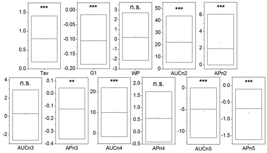 Following our established procedure, the TLB parameters were determined for the second samples of the 55 CNR patients, and a bivariate statistical analysis comparison with the first sample extracted was performed (a detailed description of the 55 patients with preparation can be found in Table S14). Many of the TLB-associated parameters (Tav, G1, AUCn2, APn2, APn3, AUCn4, AUCn5, and APn5) showed statistically significant differences between the averages/medians of both groups (p-value < 0.05; p-values were calculated according to Student’s t-test or a Wilcoxon test, both for dependent samples, depending on the normality character of the parameter distribution) (Figure 6 and Table S15).