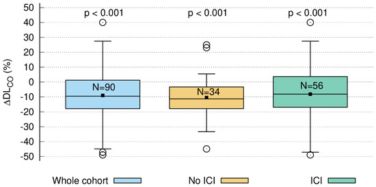Relative decline in DLCO three months after radiotherapy compared to baseline (ΔDLCO): whole cohort (blue; n = 90), patients without ICI (=immune checkpoint inhibitor; brown; n = 34), and patients with ICI (green; n = 56). The decrease in DLCO (ΔDLCO) was significant for all three groups.