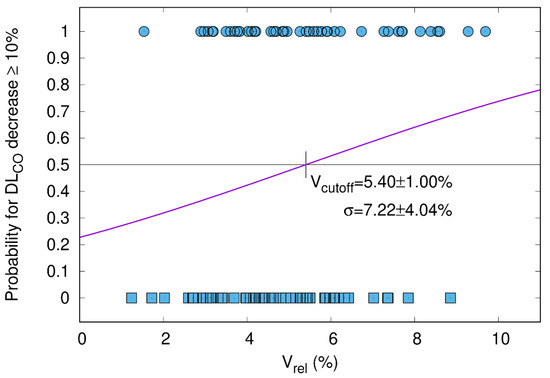 Whole cohort. The probability of DLCO decrease ≥ 10% after the end of RT (y-axis) is plotted as a function of the relative size of V65–45% with respect to total lung volume (Vrel, x-axis). The sigmoid shape of the cumulative distribution function (CDF) shows that a larger V65–45% entails a higher probability for DLCO decline. All patients had paired measurements before and three months after radiotherapy (n = 90; Pearson correlation coefficient = 0.143; p-value = 0.089). The cutoff for Vrel was 5.4%. Patients with a DLCO decrease of ≥10% and <10% are represented by circles and squares, respectively.