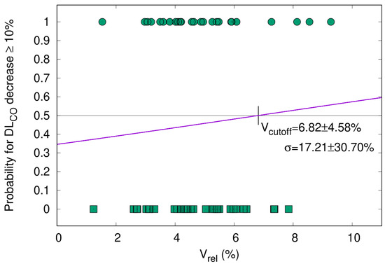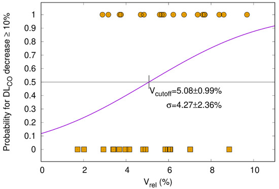 Patients without ICI (=immune checkpoint inhibitor). The probability of DLCO decrease ≥ 10% after the end of RT (y-axis) is plotted as a function of the relative size of V65–45% with respect to the total lung volume (Vrel, x-axis). The sigmoid shape of the cumulative distribution function (CDF) shows that a larger V65–45% entails a higher probability for DLCO decline. Patients had paired measurements before and three months after radiotherapy (n = 34, Pearson correlation coefficient of 0.354, p-value = 0.020). The cutoff for Vrel was 5.1%. Patients with a DLCO decrease of ≥10% and <10% are represented by circles and squares, respectively.