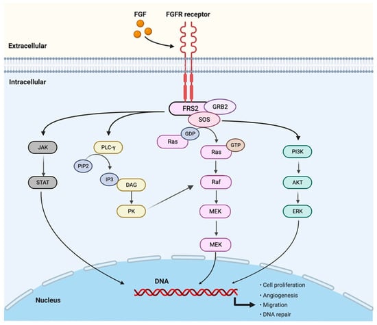 Fibroblast growth factor receptors (FGFRs) are a family of four transmembrane receptors with intracellular tyrosine kinase domains (FGFR5 acts as a co-receptor of FGFR1, lacking an intracellular domain receptor), mediated by growth factors of fibroblasts (FGFs), constituting an important signaling pathway in organ systems through the regulation of cell proliferation, angiogenesis, migration, and DNA repair (Figure 1).