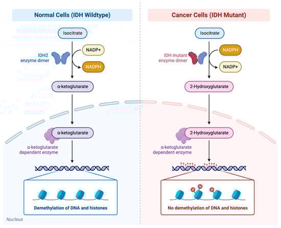 Differences between normal cells with IDH wildtype and cancer cells with IDH mutant. Mutant IDH proteins result in an abnormal enzymatic activity, allowing them to convert α-ketoglutarate (αKG) to 2-hydroxyglutarate (2HG), which inhibits the activity of multiple αKG-dependent dioxygenases. These alterations result in the impairment of the DNA, and histone demethylation. Figure created with BioRender.com.