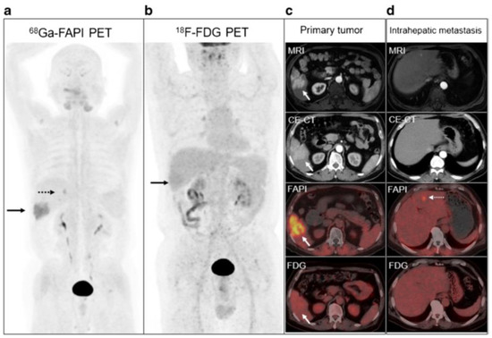 - Guo, W.; Pang, Y.; Yao, L.; Zhao, L.; Fan, C.; Ke, J.; Guo, P.; Hao, B.; Fu, H.; Xie, C. Imaging fibroblast activation protein in liver cancer: A single-center post hoc retrospective analysis to compare [68Ga] Ga-FAPI-04 PET/CT versus MRI and [18F]-FDG PET/CT. Eur. J. Nucl. Med. Mol. Imaging 2021, 48, 1604–1617. [Google Scholar] [CrossRef]
