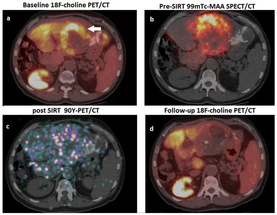 A 62-year-old man, affected by HCV-related cirrhosis, presenting a gross HCC of the left hepatic lobe, previously submitted to surgery (moderately differentiated HCC, pT2), subsequently relapsed and was treated with TACE. One year after TACE, he was referred to our department due to relapse and increased value of AFP (2357 ng/mL) for possible treatment with 90Y-microspheres. (a) Pre-treatment PET/CT scan with 18F-choline showed a hemicircular rim of increased tracer uptake (white arrow) within the HCC lesion in the left hepatic lobe (note the hyperdense material in the neighbouring parenchyma due to the previously performed TACE). (b) The patient was submitted to scintigraphy with albumin 99mTc-macroaggregates (i.e., PRE-SIRT), and coregistered SPECT-CT images showed an optimal match with respect to the location of the metabolically active lesion detected by PET/CT; (c) After selective catheterisation of the arterial feeder of the HCC lesion, 1.8 Gbq of 90Y-resin microspheres were administered; PET/CT acquired on 90Y-positron emission showed microspheres’ accumulation within the hepatic lesions; (d) 18F-choline PET/CT performed eight weeks after SIRT showed an almost complete metabolic response, consistent with a dramatic drop in AFP values (i.e., 50 ng/mL).