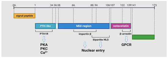 The functional domains of the PTHrP protein. The signal peptide module serves to dock the nascent peptide to the secretory pathway. “PTH-like” indicates the receptor-binding region, and “Mid-region” contains the bipartite NLS essential for PTHrP nuclear import; the C-terminal domains include “osteostatin”, which is involved in bone turnover and β-arrestin binding. The green region is part of the C-terminal that only exists in PTHrP 1–173 []. PTH: parathyroid hormone; PTHrP: parathyroid hormone-related protein; PKA: protein kinase A; PKC: protein kinase C; NLS: nuclear localization signals; GPCR: G-protein-coupled receptors.