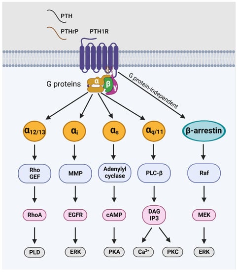 Diagram of ligand binding with PTH1R and the downstream signaling pathway. When PTH or PTHrP binds to PTH1R, it induces a conformational change in the receptor, leading to the activation of diverse downstream signal transduction pathways, via either G protein-dependent or -independent/β-arrestin-dependent mechanisms []. GEF: guanine nucleotide exchange factor; PLD: phospholipase D; MMP: matrix metalloproteinase; EGFR: epidermal growth factor receptor; MEK: mitogen-activated protein kinase; ERK: extracellular signal-regulated kinase; PKA: protein kinase A; PKC: protein kinase C; PLC-β: phospholipase C-β; DAG: diacylglycerol; IP3: inositol 1,4,5-triphosphate.