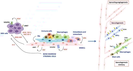 Graphical representation of BM angiogenesis and vasculogenesis in MM patients. MM cells release angiogenic cytokines (i.e., VEGF, FGF-2, HGF, IGF-1) that activate the BM niche. In turn, activated MMECs strongly express angiogenic receptors and secrete high levels of VEGF and HGF that act in an autocrine and paracrine manner. BMSCs contribute to this process by releasing angiogenic cytokines and IL-6, further sustaining the “angiogenic switch” and MM pathogenesis. This pro-angiogenic milieu leads to the formation of new blood vessels via: (i) sprouting angiogenesis; (ii) vasculogenesis through the recruitment of CD34+ endothelial progenitor cells (EPCs); and (iii) vasculogenesis mimicry through the recruitment of macrophages and mast cells.
