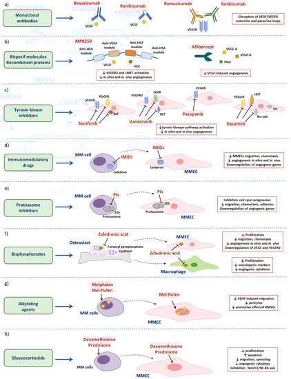 Graphical representation of the main drugs with a direct and indirect anti-angiogenic effect in MM: (a) monoclonal antibodies; (b) bispecific molecules and recombinant proteins; (c) tyrosin kinase inhibitors; (d) immunomodulatory drugs; (e) proteasome inhibitors; (f) bisphosphonates; (g) alkylating agents; and (h) glucocorticoids. Detailed description in the main text.