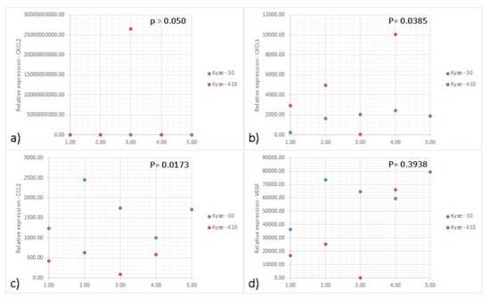 Graphs of relative expression of genes of interest performed by real-time PCR. Graphs representing the relative expression of the genes (a) CXCL-2; (b) CXCL-1; (c) CCL2; and (d) VEGF in the tumors induced by the Kyse-30 and Kyse-410 cell lines. “BDL: Below Detection Levels”. Data represent 10 animals (5 per group) from the same experiment. Each dot represents one animal; the blue dots indicate the relative expression of the different genes of each animal inoculated with Kyse-30 and the red dots of each animal inoculated with Kyse-410. All experiments were performed only once. Statistical significance was calculated by using unpaired t-test and p values are shown in the figure.