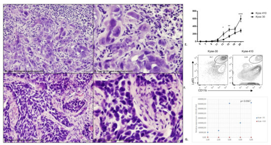 Evaluation of the intra-tumor immune cell infiltrate in the tumors induced by the Kyse-30 and Kyse-410 cell lines. (A) Representative haematoxylin and eosin (H&E) of histological section tumors induced by Kyse-30 (Original magnification ×20); (B) Representative H&E of histological sections tumors induced by Kyse-30 (Original magnification ×40); (C) Representative H&E of histological sections tumors induced by Kyse-410 (Original magnification ×20); (D) Representative H&E of histological sections tumors induced by Kyse-410 (Original magnification ×40). (E) Tumor growth curve in NSG mice inoculated with the Kyse-30 and Kyse-410 cell lines. Data represent 10 animals (5 per group) from the same experiment. Each dot represents one animal. The square dots represent each animal inoculated with Kyse-30 cell line and the spherical dots represent each animal inoculated with Kyse-410 cell line. The y-axis represents the tumor volume and the x-axis the days after inoculation of the cells. This experiment was performed only once. Statistical significance was calculated by using Anova test (* p = 0.024; ** p = 0.007; **** p < 0.0001). (F) Representative flow cytometry data of intratumoral polymorphonuclear leukocytes (CD11b+ Ly6G+) in Kyse-30 or Kyse-410 tumor-bearing mice. (G) Evaluation of the intra-tumor immune cell infiltrate in the tumors induced by the Kyse-30 and Kyse-410 cell lines by flow cytometry. Data represent 10 animals (5 per group) from the same experiment. Each dot represents one animal; the blue dots indicate CD11b+Ly6G+ expression of each animal inoculated with Kyse-30 and the red dots indicate CD11b+Ly6G+ expression of each animal inoculated with Kyse-410. All experiments were performed only once. Statistical significance was calculated by using unpaired t-test (p = 0.0367).