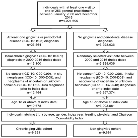 This study included patients who had received an initial diagnosis of chronic gingivitis (ICD-10: K05.1) in one of 256 general practices (1721 physicians) in the United Kingdom between January 2000 and December 2016 (index date). Inclusion criteria were as follows: patient age of ≥18 years at the index date and no cancer (ICD-10: C00–C99), in situ neoplasms (ICD-10: D00–D09), and neoplasms of uncertain or unknown behavior (ICD-10: D37–D48) diagnoses documented prior to the index date.