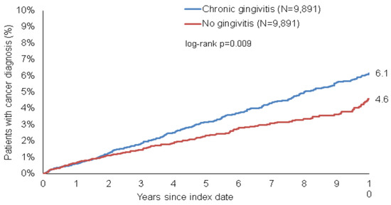 Cumulative incidence of cancer in patients with and without chronic gingivitis in the 10 years following the index date.