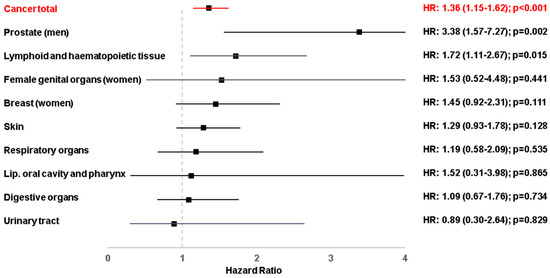 Finally, we aimed to further dissect a potential association between gingivitis and various defined cancer sites. Although the comparatively small sample sizes did not allow to identify significant associations in most cancer-site stratified analyses, we observed a trend toward a positive relationship between gingivitis and almost all distinct cancer types. However, a strong and statistically significant association was only observed for prostate cancer (HR: 3.38; 95% CI: 1.57–7.27, p = 0.002). Moreover, for lymphoid and hematopoietic malignancies, a strong and nearly significant association was observed (HR: 1.72; 95% CI: 1.11–2.67, p = 0.015; Figure 3). In contrast, we did not observe a significant association between gingivitis and female genital organ cancer (HR: 1.53; 95% CI: 0.52–4.48, p = 0.441), breast cancer (HR: 1.45; 95% CI: 0.92–2.31, p = 0.111), skin cancer (HR: 1.29; 95% CI: 0.93–1.78, p = 0.128), respiratory organ cancer (HR: 1.19; 95% CI: 0.58–2.09, p = 0.535), cancer of the lip, oral cavity, and pharynx (HR: 1.52; 95% CI: 0.31–3.98, p = 0.865) or digestive organ cancer (HR: 1.09; 95% CI: 0.67–1.76, p = 0.734, Figure 3). Altogether, these data clearly suggest a link between the presence of chronic gingivitis and the development of cancer that should be discussed with the respective patients in order to provide an optimal and holistic treatment.