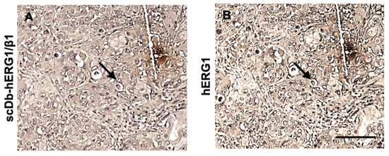 Finally, the occurrence of a hERG1/β1 integrin complex in primary PDAC was confirmed by IHC using a bispecific antibody, the scDb-hERG1-β1, which selectively recognizes the hERG1/β1 integrin complex [31,37]. In total, 132 primary PDAC samples were analysed and a high (>50% of the cells) scDb-hERG1-β1 staining was detected in 68.2% (90/132) of cases, with a statistically significant association with hERG1 staining (p < 0.0001) (Figure 2). Figure 2 shows the staining for hERG1-β1 (panel A) and hERG1 (panel B). The arrows show the same cells stained with scDb-hERG1-β1 and mAb-hERG1.