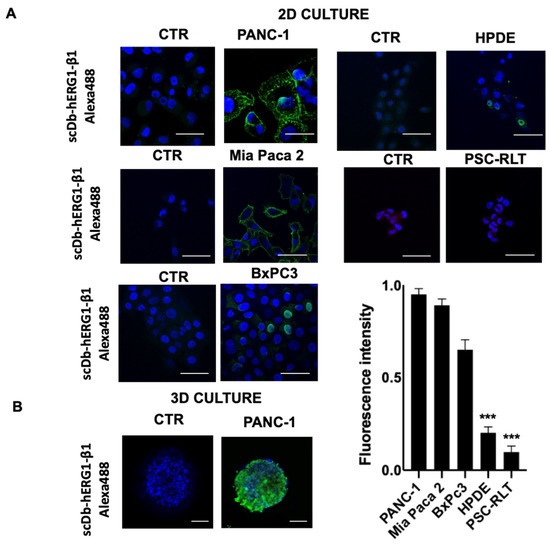 Expression of the hERG1-β1 integrin complex in PDAC and normal pancreatic cells determined by immunofluorescence (IF) and relative quantification. (A) Direct IF on fixed PANC-1, Mia Paca2, BxPC3, HPDE and PSC-RLT cells using the scDb-hERG1-β1-Alexa488 cultured in 2D. The picture labelled as “CTR” represents cells incubated with only the secondary antibody. Representative of three independent experiments performed in each cell line; the corresponding densitometric results are given in the bar graph on the right. p values were calculated using the Student’s t test. Scale bar = 100 μm. (B) Direct IF on fixed PANC-1 cells cultured as 3D using the scDb-hERG1-β1-Alexa488. The picture labelled as “CTR” represents cells incubated with only the secondary antibody. Representative of three independent experiments. Scale bar = 50 μm. *** p < 0.001.
