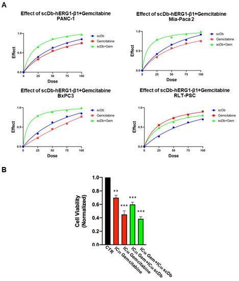 The effects of Gemcitabine and of scDb-hERG1-β1 on the vitality of the cell lines described above were then determined. Figure S1 shows the dose-response curves for Gemcitabine and scDb-hERG1-β1 in PANC-1, MiaPaCa-2, BxPC3 and PSC-RLT cells. These data allowed us to determine the IC50 values (Table 2). The efficacy of Gemcitabine was high (IC50 < 5 μM) for BxPC3, good (IC50 ~ 40 μM) for PANC-1 and MiaPaca-2 cells, and low for PSC-RLT (IC50 > 150 μM). The scDb-hERG1-β1 showed high efficacy (IC50 ~ 20 μg/mL) for PANC-1 and MiaPaca-2 cells, low efficacy (IC50 = 160 μg/mL) for BxPC3 and insignificant efficacy (IC50 > 500 μg/mL) for PSC-RLT. Overall, the scDb-hERG1-β1 IC50 values agree with the expression levels of the hERG1/β1 integrin complex in the pancreatic cell lines studied. Starting from the IC50 values experimentally determined, we used different doses (IC25, IC75 and IC100) of either Gemcitabine, scDb-hERG1-β1 or their combinations to measure the combination index (CI) as in [36] (Figure 4A). The CI values clearly indicate a synergistic effect of the scDb-hERG1-β1 and Gemcitabine combination but only in the PDAC cells which express the hERG1/β1 integrin complex (Table 2). The effects of the combination of the IC50 and IC25 doses of Gemcitabine with the IC50 of scDb-hERG1-β1 on PANC-1 cells are shown in Figure 4B.