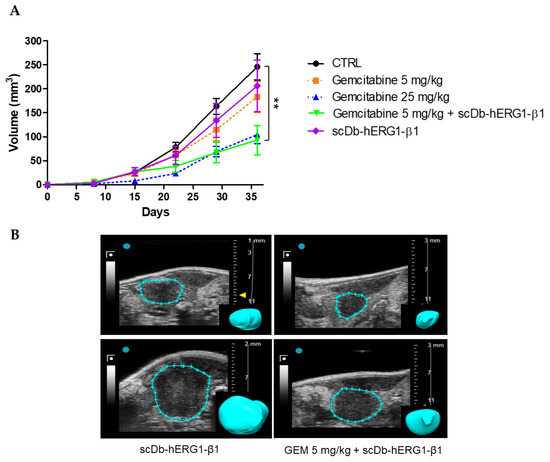 The orthotopic xenograft model was obtained by the injection of PANC-1 cells into the mice pancreas. The ultrasound (US)-guided injection method detailed in [38] was followed using the VevoLAZR-X imaging system (Fujifilm Visualsonics, Toronto, ON, Canada). The injection was performed into female athymic Foxn1nu/nu mice (6 weeks; Envigo, Indianapolis, IN, USA). PANC-1 cells were cultured in DMEM + 10% FBS medium, under the conditions of 37 °C and 5% CO2. For the injection, 1 × 106 tumour cell lines were suspended in 20 µL of PBS. To evaluate the therapeutic effect of the combination of the scDb-hERG1-β1 with Gemcitabine, mice were divided into 5 groups of treatment, 8 days after the cell injection: (i) control (saline; n = 16); (ii) scDb-hERG1-β1 (16 mg/kg; n = 8); (iii) Gemcitabine (5 mg/kg; n = 11); (iv) Gemcitabine (25 mg/kg; n = 7); and (v) scDb-hERG1-β1/16 mg/kg + Gemcitabine/5 mg/kg (n = 5). The treatments were administrated starting from day 8 and ended on day 36.
