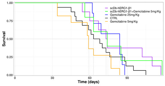 The control and the 5 mg/kg Gemcitabine-treated groups showed a similar survival trend, thus reflecting the inefficacy of the treatment provided by the sub-optimal dose of Gemcitabine (Figure 8). Mice treated with the therapeutic dose (25 mg/kg) of Gemcitabine (blue line) started to die later, but later showed a narrower time window (days 62–88) of death, if compared to all the other groups (Figure 8). This fact is consistent with the high toxicity of Gemcitabine. Indeed, mice treated with 25 mg/kg of Gemcitabine showed severe signs of suffering, such as reduced motility and back arching, which induced us to apply euthanasia. In addition, this group and the control group showed decreased nest-building behaviour earlier than the other groups. In this group, the mean survival time was 77 days, longer than either the control group (67 days) or the group treated with Gemcitabine at a sub-optimal dose (59 days). The difference in mean survival time between the group treated with therapeutic doses (25 mg/kg) and sub-optimal doses (5 mg/kg) of Gemcitabine was statistically significant (p = 0.02)—Table S1 in the Supplementary Materials. An increased mean survival time was observed in the groups treated with scDb-hERG1-β1 (79 days) and in the group treated with scDb-hERG1-β1 in combination with 5 mg/kg Gemcitabine (82 days) compared to all the other groups. The mean survival time of the group treated with scDb-hERG1-β1 was significantly different from the mean survival time of the group treated with 5 mg/kg Gemcitabine (p = 0.05, Table S1). The mean survival time of the group treated with the combination of sub-optimal doses of Gemcitabine in combination with scDb-hERG1-β1 was much higher than the mean survival time of the group treated with sub-optimal doses of Gemcitabine (82 days vs. 59 days, p = 0.1, Table S1).