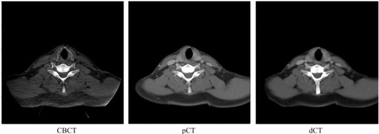- Xue, X.; Ding, Y.; Shi, J.; Hao, X.; Li, X.; Li, D.; Wu, Y.; An, H.; Jiang, M.; Wei, W.; et al. Cone beam CT (CBCT) based synthetic CT generation using deep learning methods for dose calculation of nasopharyngeal carcinoma radiotherapy. Technol. Cancer Res. Treat. 2021, 20, 15330338211062415. [Google Scholar] [CrossRef] [PubMed]