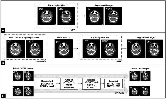 Flowchart of the data preparation process. (A) pCT was registered to CBCT using the multi-modal rigid registration algorithm with manual adjustment in MITK workbranch. (B) pCT was transformed to align with CBCT using the DIR algorithm in Velocity™. The HU values of pCT were then deformed to the CBCT anatomy to create dCT. dCT was then was registered to CBCT in MITK workbranch. (C) Both the pCT and dCT volumes were resampled to match the CBCT’s voxel spacing and cropped to match its dimensions using MATLAB.
