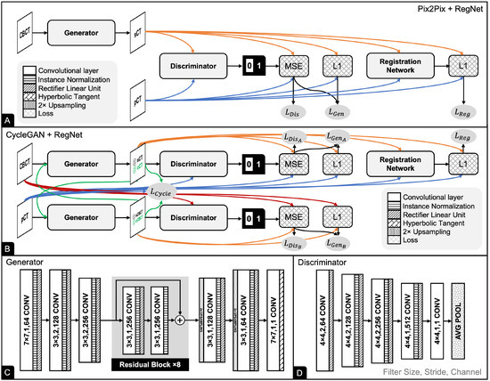 Pix2Pix and CycleGAN share common generator and discriminator architectures. RegNet was coupled with Pix2Pix and CycleGAN during training. (A) Pix2Pix has one discriminator and one generator. (B) CycleGAN has two discriminators and two generators. (C) The generator consists of three convolution blocks, eight residual blocks, and three convolution blocks with upsampling. (D) The discriminator comprises a series of convolutions, nonlinear activations, and average-pooling operations. Values in the convolutional layer box indicate the size of the kernel, the number of strides, and the number of channels, respectively.