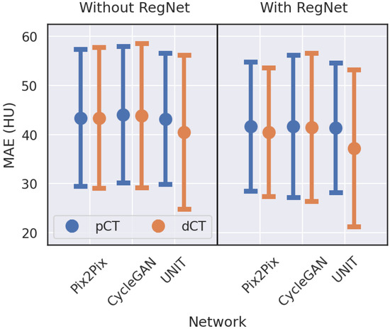 Figure 6 illustrates the effects of RegNet on MAEs between sCT generated from different models and from pCT and dCT. For the models without RegNet, UNIT performed slightly better than the other two and dCT resulted in a lower MAE than pCT. For the models with RegNet, the MAEs values were lower for the same configuration and the effects were more pronounced for the models with dCT, especially for UNIT. UNIT with RegNet generated sCT with the lowest mean MAE.