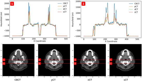 HU line profiles of CBCT, pCT, dCT, and sCT on two different lines passing through the patient’s body in different areas. The top two images show each HU line profile (1 and 2) corresponding to the two red dashed lines (1 and 2) shown in each of the bottom four images of CBCT, pCT, dCT, and sCT.