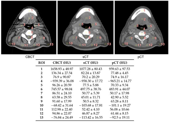 Figure 9 shows the HU values for 13 different regions of interest (ROIs). The ROIs were positioned for bone, air, and soft tissue in different regions on the CBCT, sCT, and pCT images. The HU values of sCT were closer to those of pCT than those of CBCT in all regions.