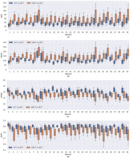 Figure 10 shows a comparison of sCT with dCT and CBCT with dCT in terms of different similarity metrics, such as MAE, RMSE, PSNR, and SSIM, for all patients in the test set. sCT was generated using UNIT with RegNet. The values were calculated across all slices for each patient. This illustrates the variations in the different similarity metrics for each patient. For MAE and RMSE, sCT had lower values than CBCT in all cases. For PSNR and SSIM, sCT had higher values than CBCT in all the cases. The variations in HU values across different patients were not extreme. The results showed that the sCT generated from UNIT with RegNet was improved over the original CBCT.