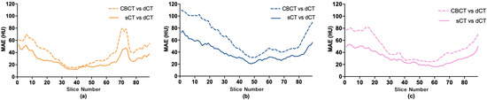 Comparison of sCT with dCT and CBCT with dCT using MAE for each slice on (a) Patient 1 (b) Patient 5 (c) and Patient 10.