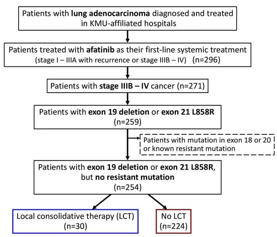 In the current study, we enrolled all patients with advanced (stage IIIB–IV) lung adenocarcinoma, who were naïve to systemic treatment and were treated with afatinib as their first-line systemic treatment (Figure 1). Only those with EGFR exon 19 deletion or exon 21 L858R point mutations were included, and those with potentially treatment-resistant mutations were excluded. Baseline clinical characteristics were determined by retrospective chart review, including age at diagnosis, sex, Eastern Cooperative Oncology Group (ECOG) performance status (PS), smoking history, family history, EGFR mutation, tumor–node–metastasis (TNM) status, and the presence of metastatic sites at the time of afatinib initiation. Patients who received LCT, including operation (curative surgical intervention, such as wedge resection, segmentectomy, lobectomy, or pneumonectomy) and local radiotherapy (definitive radiotherapy for the primary lung mass), were identified.