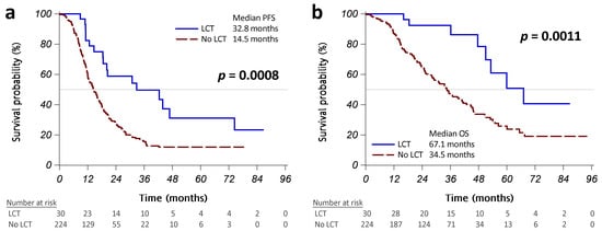 The initial treatment response was similar in patients with or without LCT (Table A1 in Appendix A). Patients with LCT had a significantly better PFS than those without LCT (median PFS: 32.8 vs. 14.5 months, p = 0.0008; Figure 2a). More than half of the patients who received operations did not present disease progression, and those treated with radiotherapy had a median PFS of 20.4 months (Figure A1a in Appendix A). Univariate Cox regression analyses revealed that LCT was associated with significantly better PFS (HR [95% CI]: 0.43 [0.26–0.72], p = 0.0011; Table 2). Worse ECOG PS, brain metastasis, pleural metastasis/effusion, bone metastasis, and liver metastasis were significantly associated with poorer PFS. Multivariable analysis using backward variable selection confirmed LCT as an independent prognostic factor for better PFS (HR [95% CI]: 0.45 [0.27–0.75], p = 0.0021 in model 1R; 0.44 [0.26–0.73], p = 0.0016 in model 2R). We also identified several independent prognostic factors for worse PFS, including pleural metastases/effusion and bone metastases (Table 2).