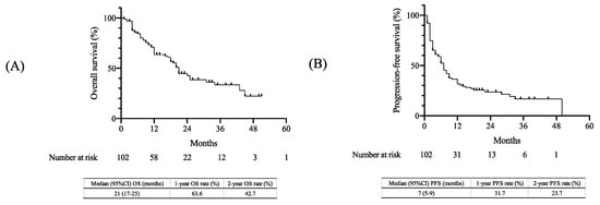 OS and PFS were estimated using the Kaplan–Meier method (Figure 1). The median OS was 21 months (95% confidence interval [CI], 17–25 months), with 1-year and 2-year OS rates of 63.6% and 42.7%, respectively (Figure 1A). Additionally, the median PFS was estimated to be seven months (95% CI, 5–9 months), with 1-year and 2-year PFS rates of 31.7% and 23.7%, respectively (Figure 1B).