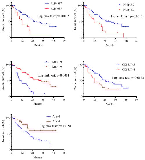 Kaplan–Meier curves for correlation between overall survival and PLR, NLR, LMR, CONUT score, and Alb level according to cutoff values. Significant differences in overall survival were observed between the two groups for each biomarker.