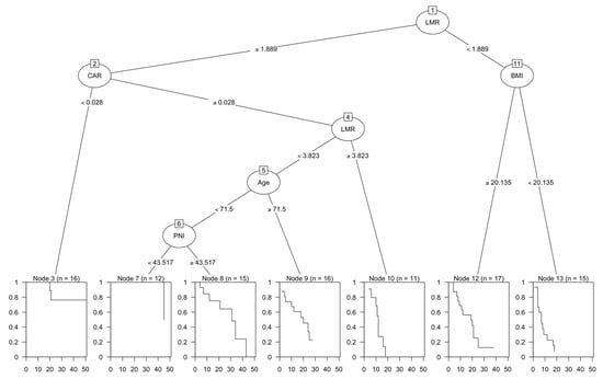 Classification and regression tree (CART) analysis. The root node was first divided based on LMR. For a high LMR, an interaction was found between CAR, age, PNI, and overall survival. For a low LMR, an interaction was found for BMI.