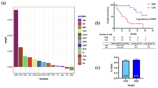 (a) The analysis of the importance of included factors using random survival forest (RSF). LMR had the highest weight of all factors. (b) Kaplan–Meier survival curves and log-rank tests by predicted survival rate using the RSF model. There was a significant difference between the two groups. (c) Comparison of c-index by model. RSF had a c-index of 0.71, while the cox proportional hazard model had a c-index of 0.67, which was slightly higher for RSF.