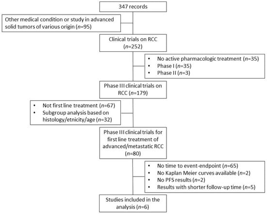 The main inclusion criteria were: (a) previously untreated adult patients with aRCC; (b) phase III trial; (c) PFS or OS endpoint; (d) results reported as a KM curve. For each curve of included trials, we collected the number of enrolled patients and the number of events (progression or death for PFS, death for OS). To avoid duplicate inclusion of patients of the same trial, we considered only the most recent publication.