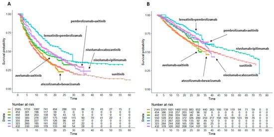 For each combination treatment, median PFS and OS were determined from reconstructed data and compared to sunitinib using Cox statistics for time-to-event end-points. We reported results as hazard ratio (HR) with a 95% confidence interval (95%CI). Indirect comparisons between treatments (in all head-to-head combinations) have been performed using the Cox model under the R-platform. Heterogeneity across control groups of different RCTs was quantified according to the likelihood ratio test and the concordance test. Statistical analyses were performed using the “survival” package under the R-platform (version 4.2.1) and SygmaPlot (version 13) software.