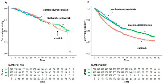 Multi-treatment KM curves are depicted in Figure 4A,B.