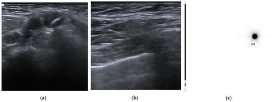 Clip placement and pre-surgical identification of clipped axillary lymph node. (a) A clip marker was placed within the cortex of the histologically confirmed metastatic axillary lymph node (clipped lymph node, CLN) before the beginning of neoadjuvant chemotherapy. (b) Before surgery, an US axillary evaluation was performed to identify the CLN and a radioactive tracer—Technetium 99mTc macro-aggregated albumin (99mTc-MAA)—was injected into the CLN under US guidance using a 21G needle. (c) Pre-surgical scintigraphic acquisition shows the presence of focal activity in the tracer inoculation site.
