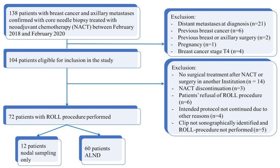 Before surgery (from 24 to 3 h before surgery), an experienced breast radiologist performed an US axillary evaluation to determine the axillary status after NACT and identify the CLN. Then, the ROLL of the CLN was performed. In the ROLL technique, a radioactive tracer—specifically, Technetium 99 mTc macro-aggregated albumin (99mTc-MAA; activity min-max: 18–37 MBq; Volume: 0.2–0.4 mL) —is injected into the CLN under US guidance using a 21G needle. At the time of surgery, the ROLL-localized CLN was resected first, followed by the removal of the remaining SLNs. A hand-held gamma probe was used to guide the intra-operative identification of the ROLL-marked CLN and its surgical resection. The presence of the pre-NAC-placed biopsy clip within the localized LN was immediately confirmed upon specimen radiograph. SLNB was performed using the blue dye method [22]. The CLN, SLN(s), and any additional resected lymph nodes were identified and individually sent for pathological examination. ALND was always performed after the pathological examination of the SLN/CLN showed a tumor-positive result, while for the patients with a complete clinical response and tumor-negative SLN/CLNs, the surgeon could choose to omit ALND and perform only nodal sampling.