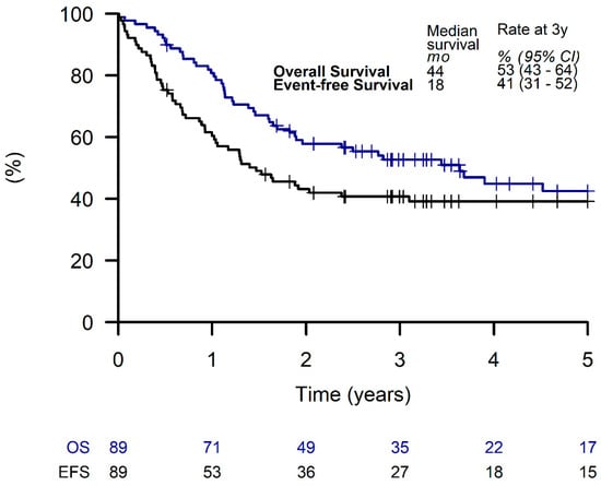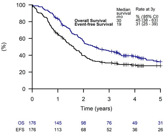 The median (range) follow-up time was 121 weeks (1 to 278 weeks). Estimated 3-year EFS and OS for all patients were 31% (95% CI, 25 to 39%) and 45% (95% CI, 38 to 63%), respectively (Figure 2).