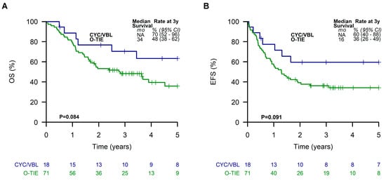 No significant differences of EFS or OS were seen in patients of the LTMT group with respect to the different initial chemotherapy approaches using Window TC/VAIA versus CEVAIE (Supplementary Figure S1). Comparing the two different LTMT regimes O-TIE (n = 71) and CYC/VBL (n = 18), patients receiving CYC/VBL showed a tendency towards better EFS and OS of 60% (95% CI, 40 to 88%) and 70% (95% CI, 52 to 96%), respectively, compared to those receiving O-TIE (EFS, 36% (95% CI, 26 to 49%); OS, 48% (95% CI, 38 to 62%)), although these differences did not reach statistical significance (OS p = 0.08, EFS p = 0.09) (Figure 4).