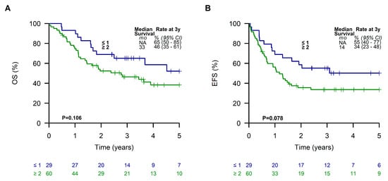 When dividing analyzed LTMT patients into two subgroups according to the Oberlin prognostic score, patients with a favorable prognostic score of ≤1 showed a 3-year EFS and OS of 55% (95% CI, 40 to 77%) and 65% (95% CI, 50 to 85%), respectively. In contrast, patients with a score of ≥2 had a poor outcome with a 3-year EFS and OS of 34% (95% CI, 23 to 48%) and 46% (95% CI, 35 to 61%), respectively (Figure 5).